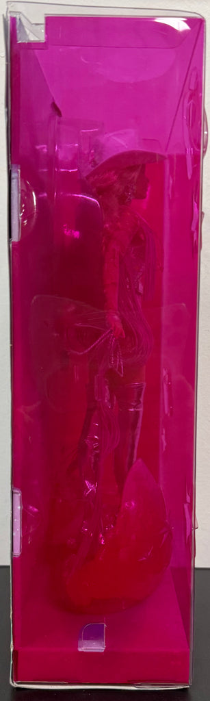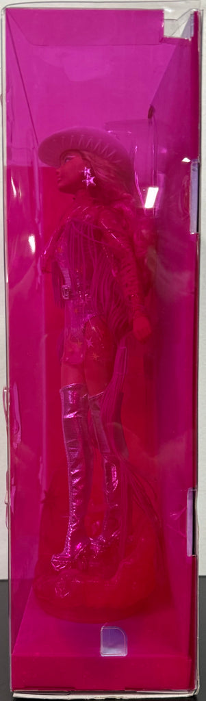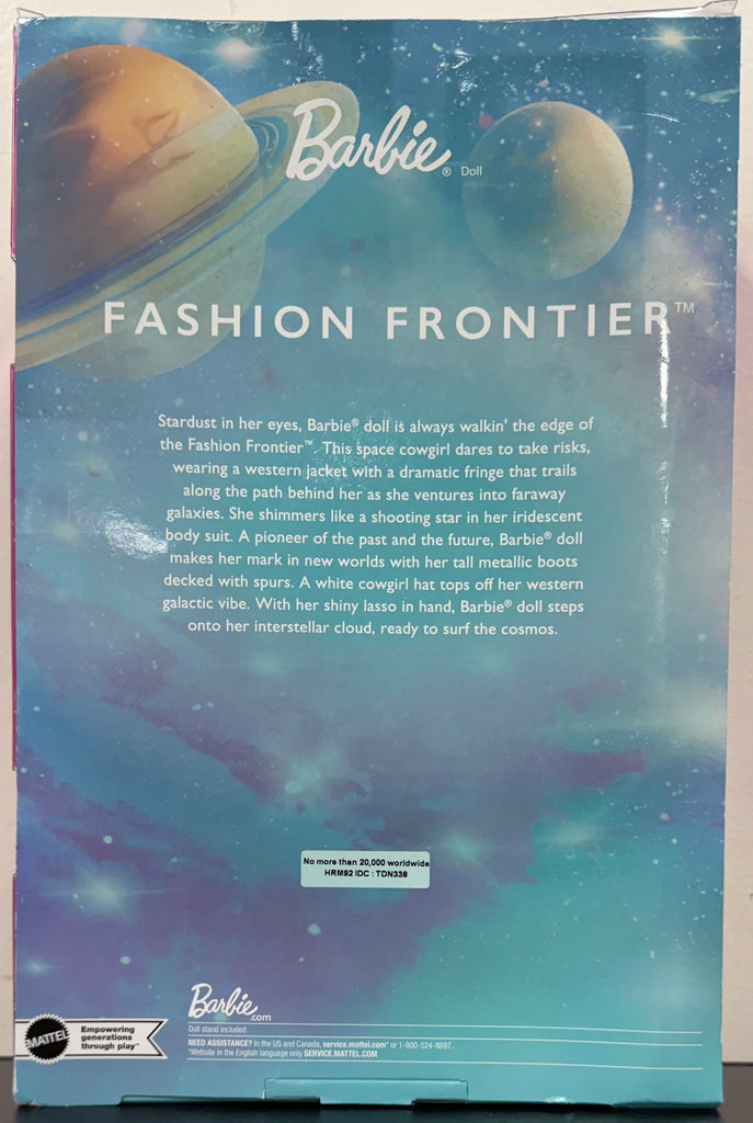 Travel through time and space with the first doll in the Barbie Fashion Frontier series, featuring collectible dolls from a western galactic world far, far away. This Barbie shimmers in an iridescent bodysuit and starry mini skirt, paired with a fringed pioneer jacket. Spectacular accessories, including the white cowgirl hat and tall silver boots, launch this look into the stratosphere.