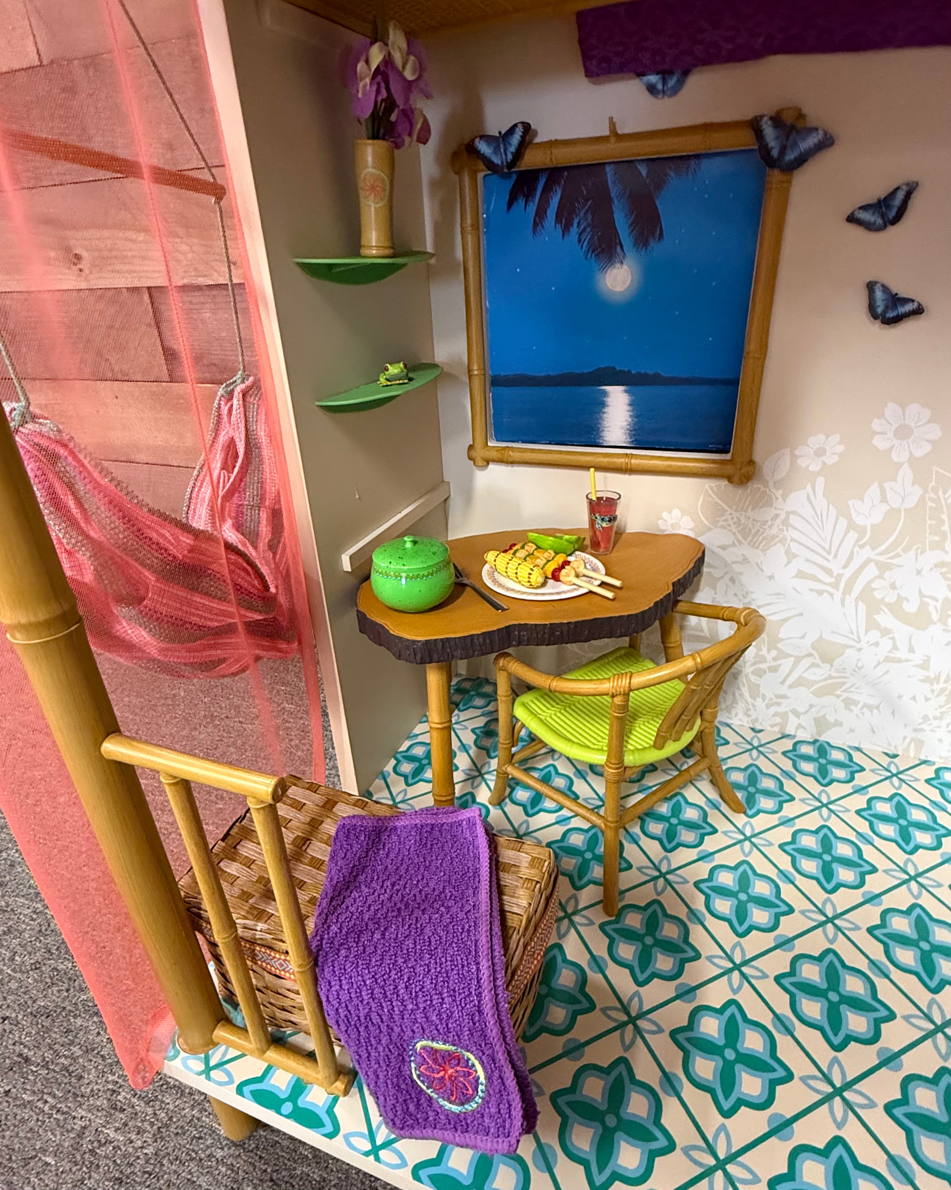 Lea's Rainforest Hut came from a beloved and very well cared-for American Girl collection, and it is in excellent condition! The only items missing are two paper postcards and one paper tablet screen.