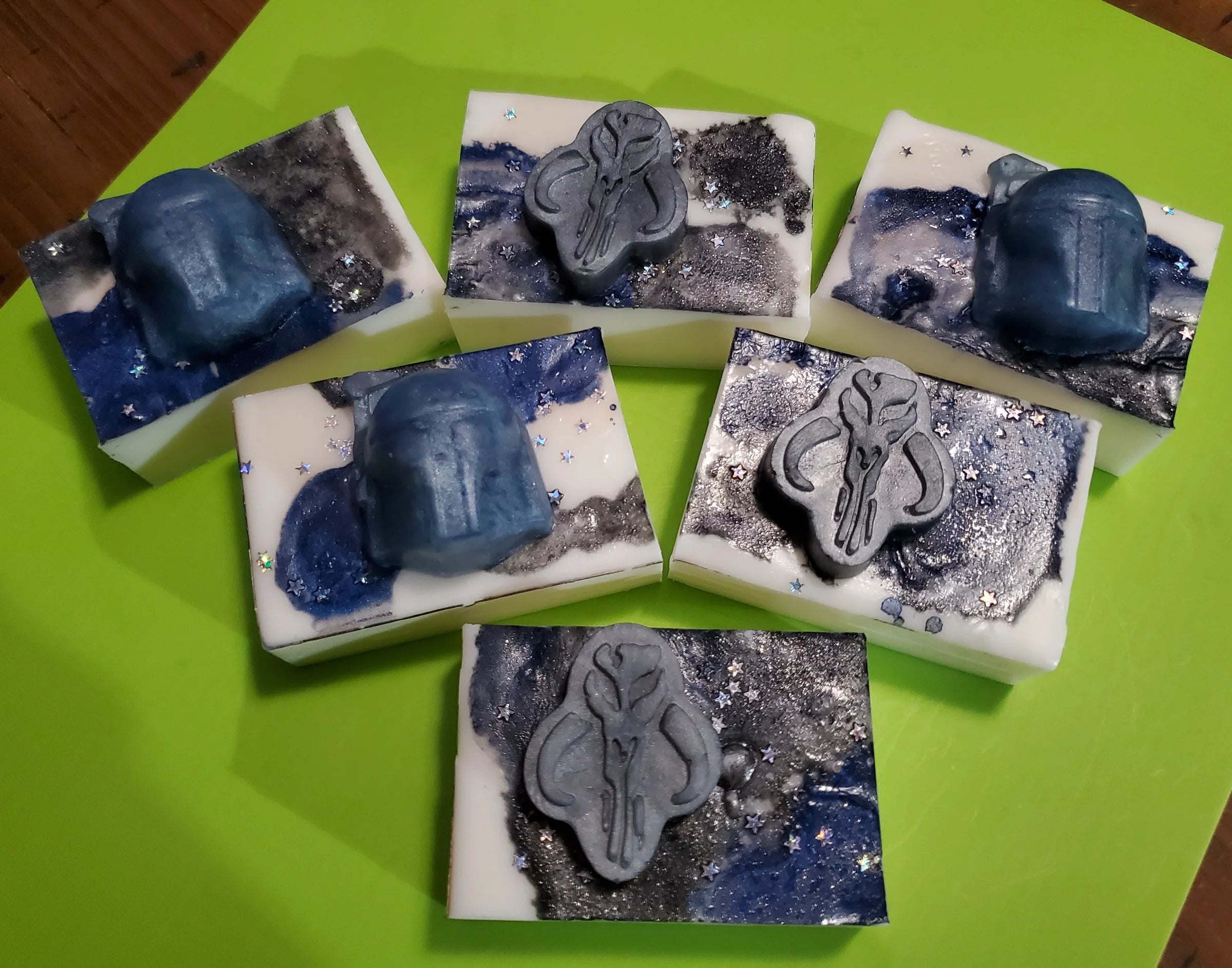Inspired by "A galaxy far, far away". This handcrafted goat milk soap has scent notes of bergamot, olive, aloe blossom, pear, white lily, heliotrope, green tea, rose, musk, sugared amber, and sandalwood. Each soap features an important piece of the galaxy. Nebulous mica and some biodegradable star glitter round out the look.